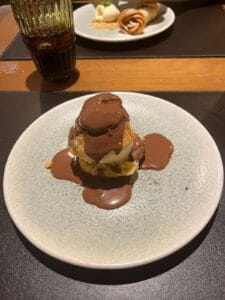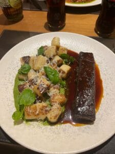 De entrada, escolhemos um bolinho do dia (no dia era de salmão) e o mini hambúrguer de costela, que foram ótimas entradas, bem saborosas e leves, não pesando muito para o prato principal. Agora, já nos pratos principais, os escolhidos foram a Lasanha di nonna alla Bolonhesa, que acompanhava um molho de tomate com um mix de queijos ao estilo della nonna e o segundo prato foi a costela prensada com gnocchi acompanhada de um molho pesto cremoso. Ambos os pratos estavam bem saborosos e com certeza repetiríamos. A quantidade é ideal, sem deixar aquela sensação de peso no estômago.